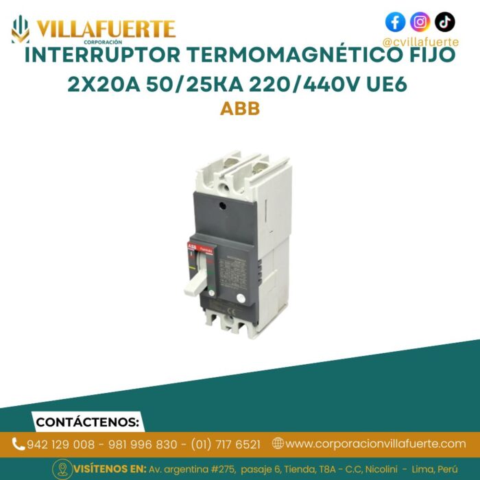 Interruptor termomagnético fijo 2x20A 50/25kA 220/440V UE6 ABB