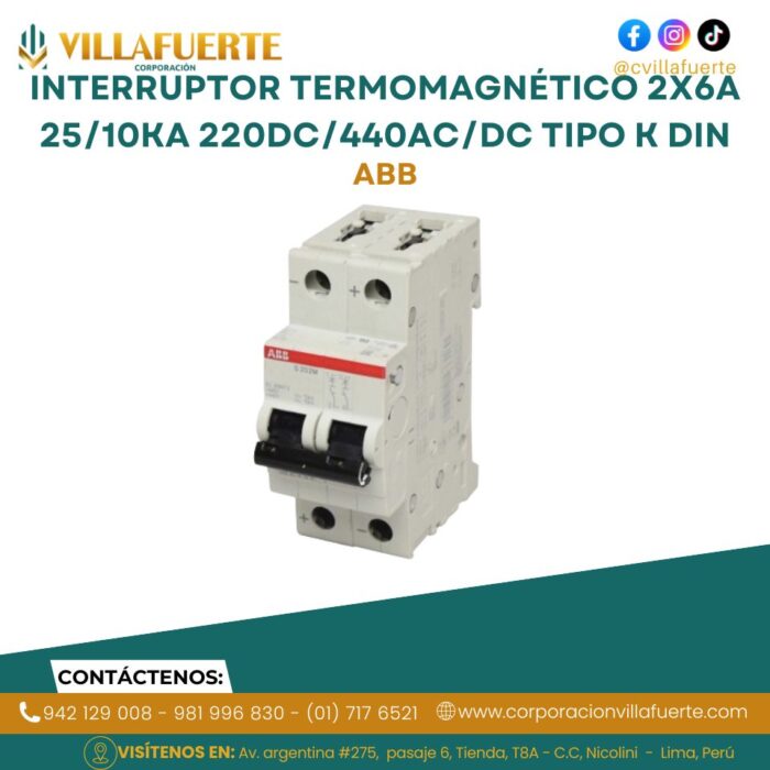 Interruptor termomagnético 2x6A 25/10kA 220DC/440AC/DC tipo K DIN ABB