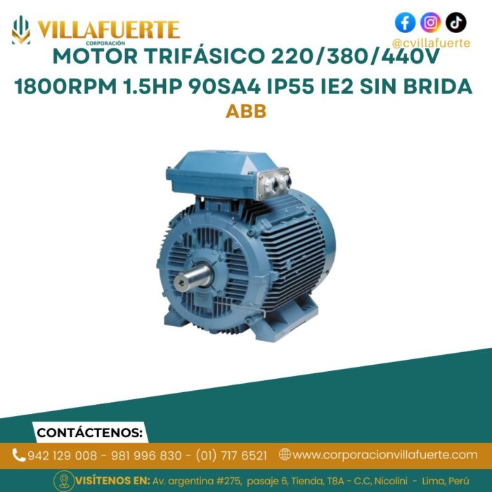 Motor trifásico 220/380/440V 1800RPM 1.5HP 90SA4 IP55 IE2 sin brida ABB