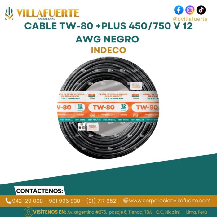 Cable TW-80 +plus 450/750 V 12 AWG Negro INDECO