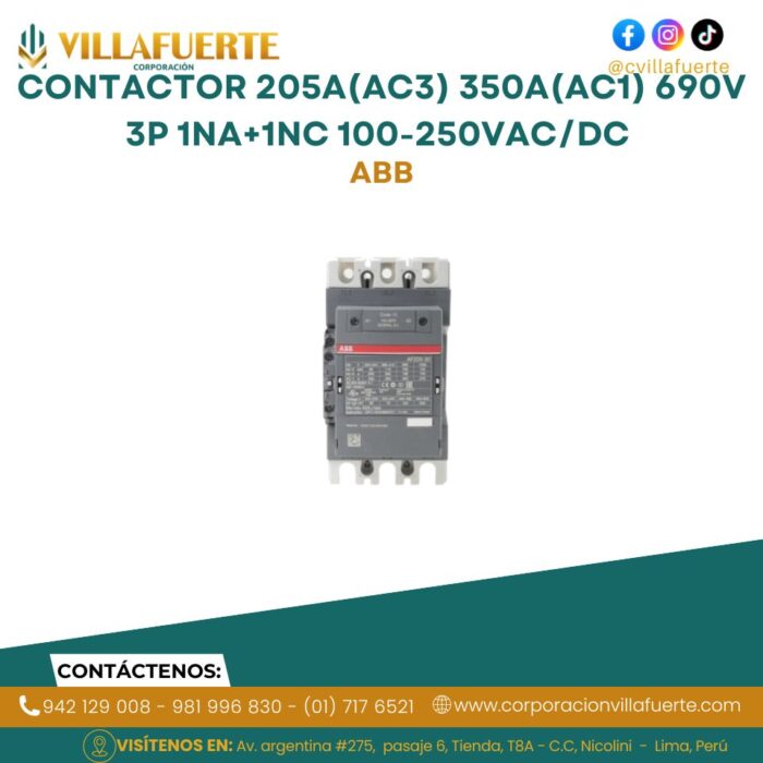 Contactor 205A(AC3) 350A(AC1) 690V 3P 1NA+1NC 100-250VAC/DC ABB