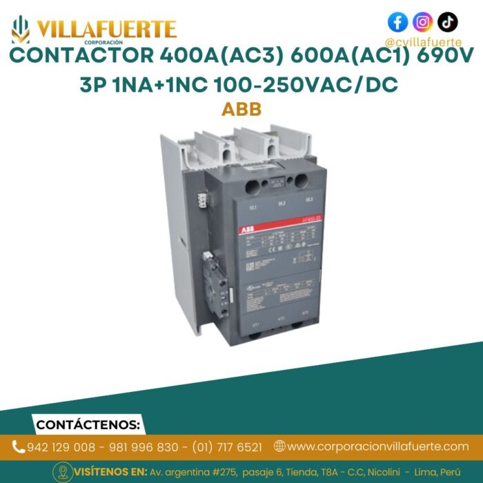 Contactor 400A(AC3) 600A(AC1) 690V 3P 1NA+1NC 100-250VAC/DC ABB