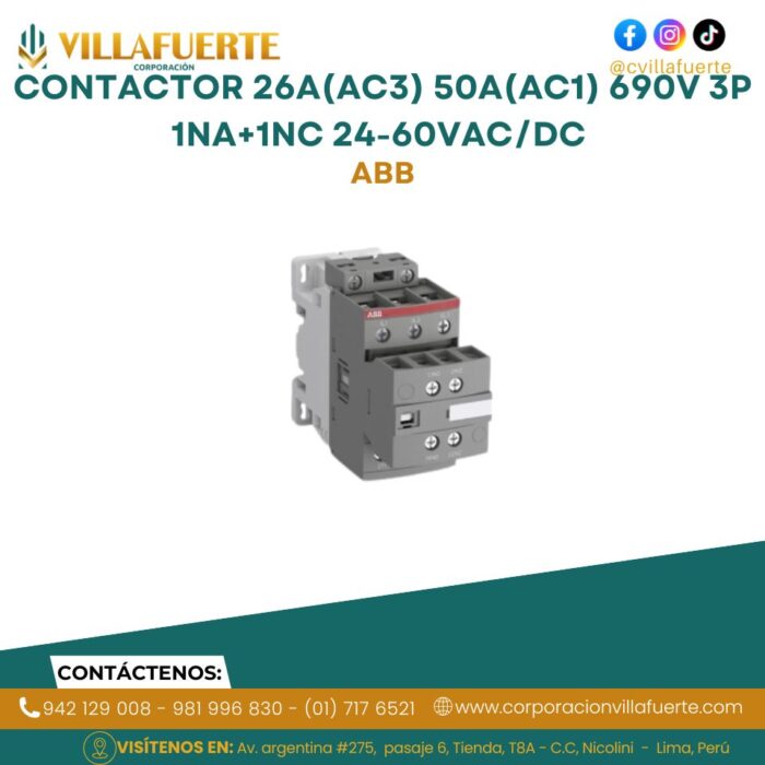 Contactor 26A(AC3) 50A(AC1) 690V 3P 1NA+1NC 24-60VAC/DC ABB