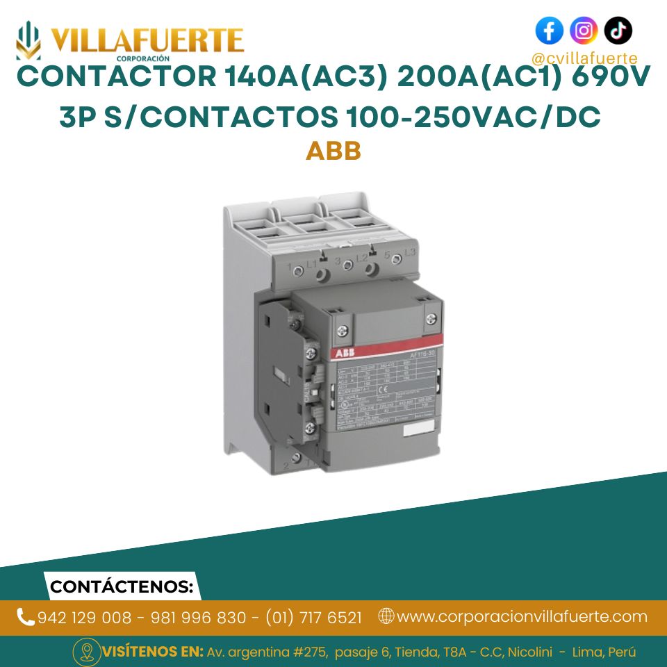Contactor 140A(AC3) 200A(AC1) 690V 3P s/contactos 100-250VAC/DC ABB