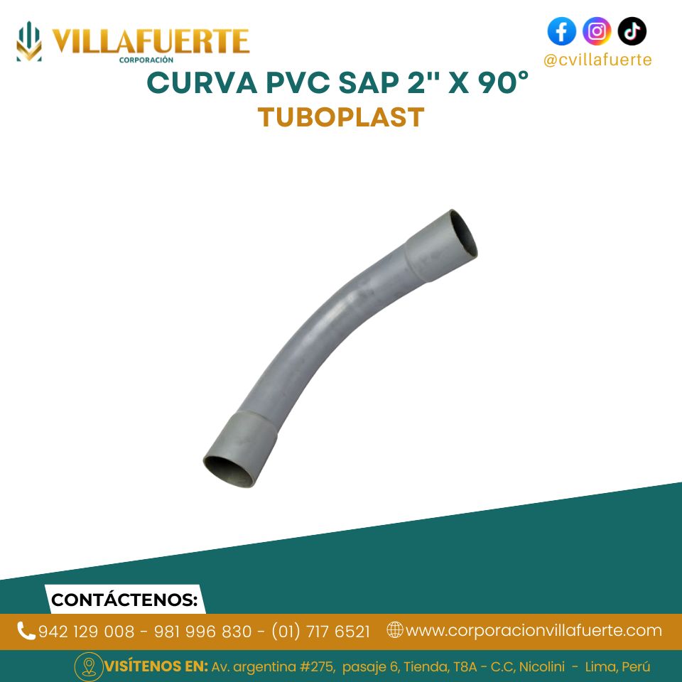 Curva para tuberías de PVC tipo SAP de 2″. La curva SAP es ideal para conexiones eléctricas pesadas como en edificios, negocios o centros comerciales.