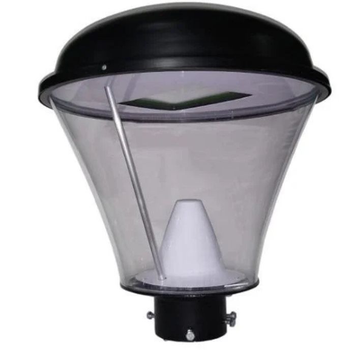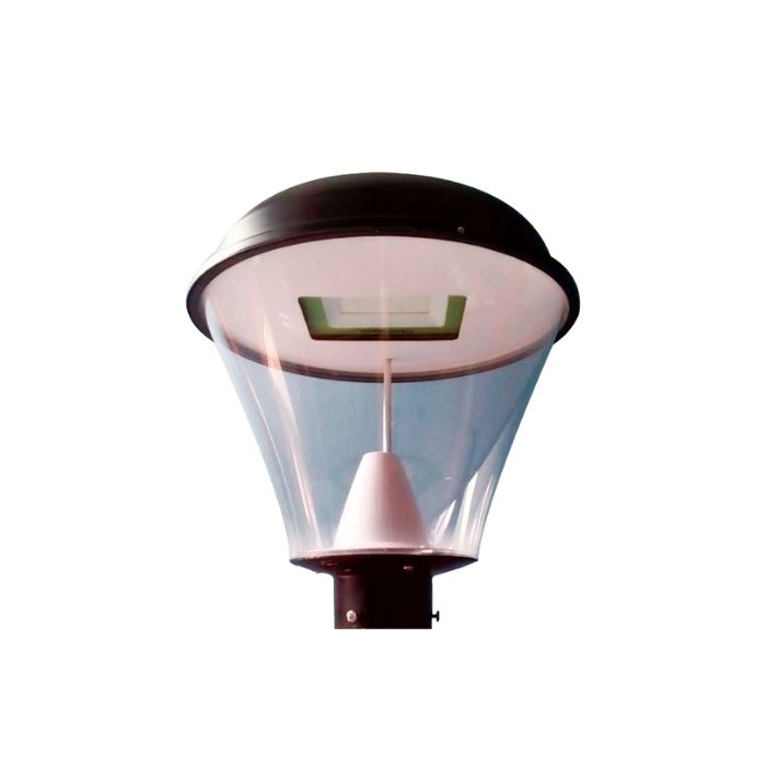Farola acrílica cristal cónica con reflector led incorporado. Luminaria elaborada para la iluminación de plazas, parques condominios de uso exterior. La luminaria está conformada por mica acrílica cristal, Tiene una base de aleación de aluminio fundido con acabado pintado del color según se solicite. Disponible en las potencias de 50W y 100W.