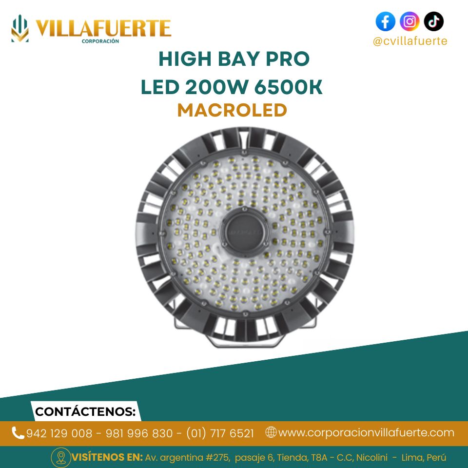 La High Bay Pro LED 200W 6500K Macroled es una luminaria industrial de alto desempeño diseñada para espacios de gran altura. Proporciona una potente luz blanca fría de 6500K, ideal para lograr iluminación uniforme y clara en áreas amplias. Su estructura robusta garantiza una excelente disipación térmica y larga vida útil. Gracias a su tecnología LED eficiente, reduce el consumo energético y asegura un funcionamiento confiable en entornos industriales exigentes.