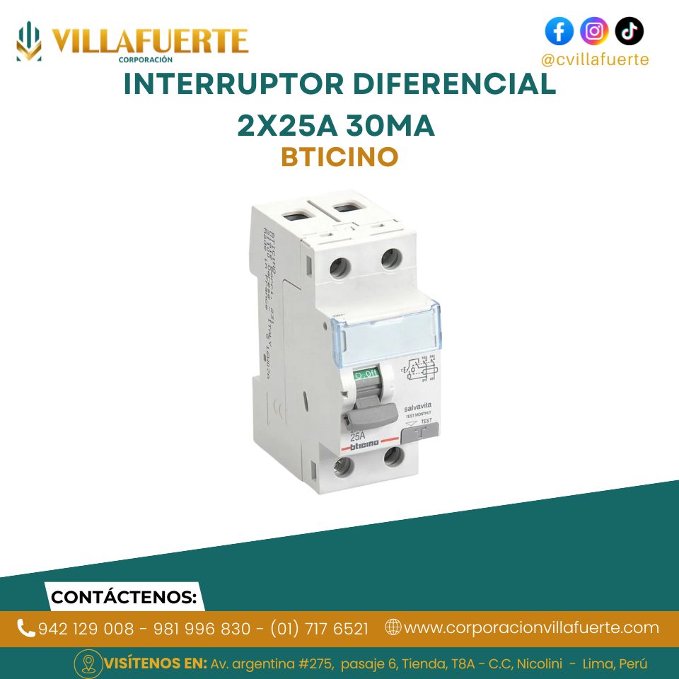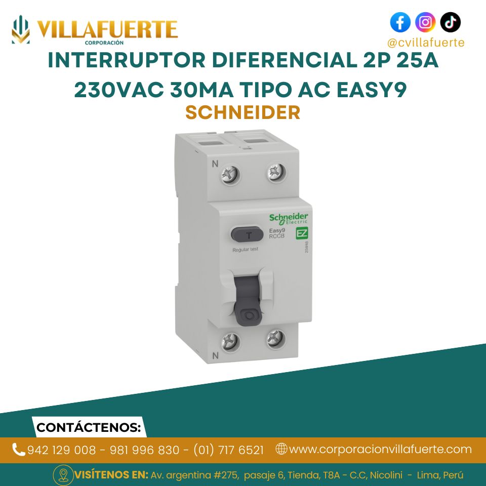 INTERRUPTOR DIFERENCIAL 2P 25A 230VAC 30MA TIPO AC EASY9 EZ9R36225 SCHNEIDER ELECTRIC, botón de prueba e indicador frontal para disparo por falla.