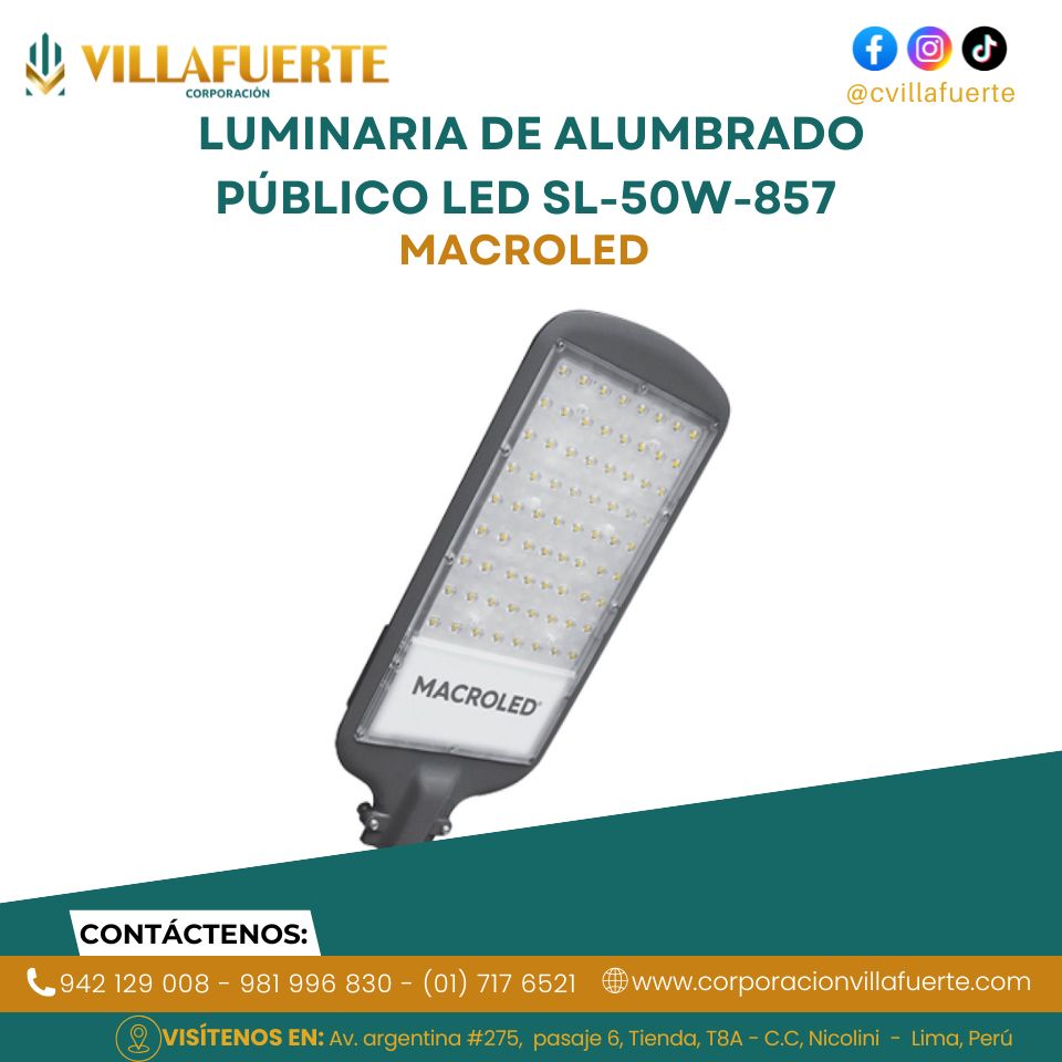 LUMINARIA DE ALUMBRADO PÚBLICO LED SL-50W-857 6.000LM IP65 MACROLED, equivalente 70W, ángulo de apertura 105°, 50,000 horas de vida útil, 3 años de garantía.