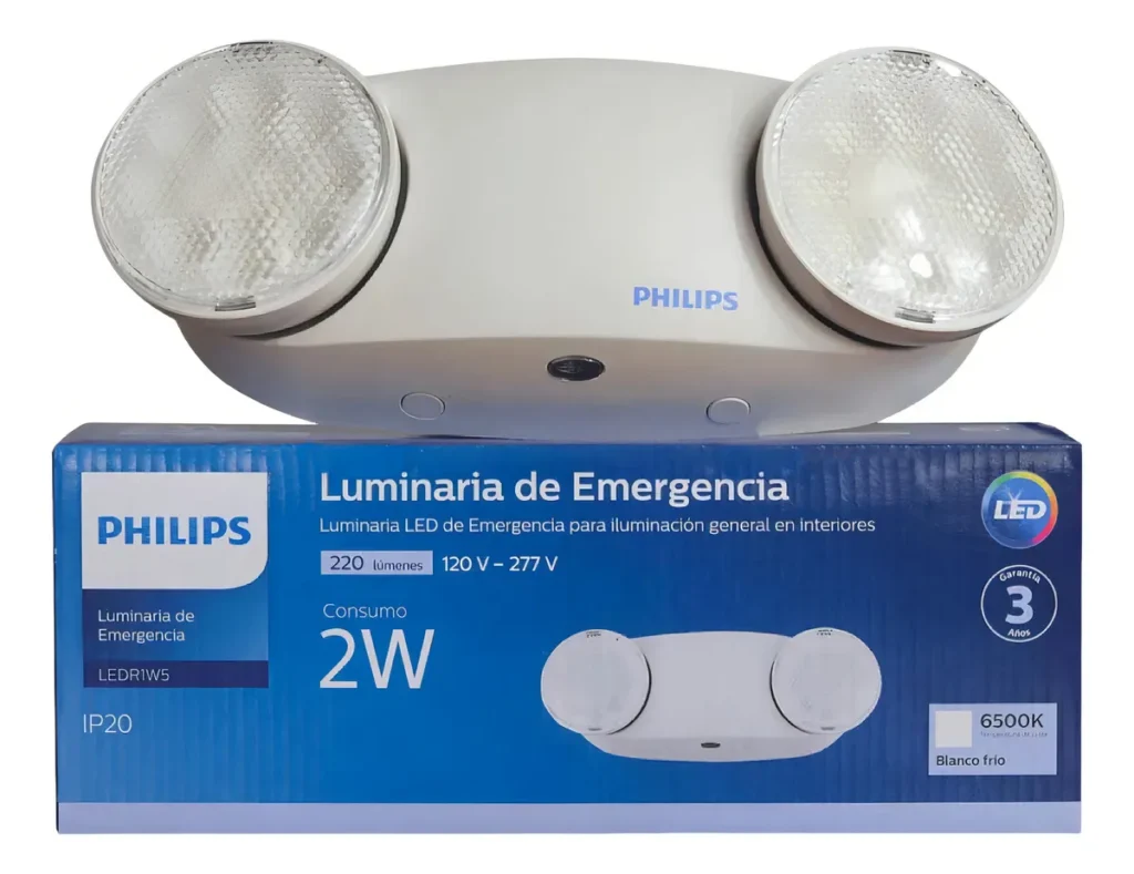 LUMINARIA EMERGENCIA LED 2X 2W 120-277V 220LM 1.5H IP20 LEDR1W5 PHILIPS, luminaria de emergencia de alta durabilidad LED consumo 2W flujo Luminoso 220 lúmenes de salida grado de protección ip20 Reflector de alta eficiencia y que proporciona excelente distribución de luz focos ajustables trae más flexibilidad al producto carcasa plástica na color blanca, robusta, 5VA retardante de llama.