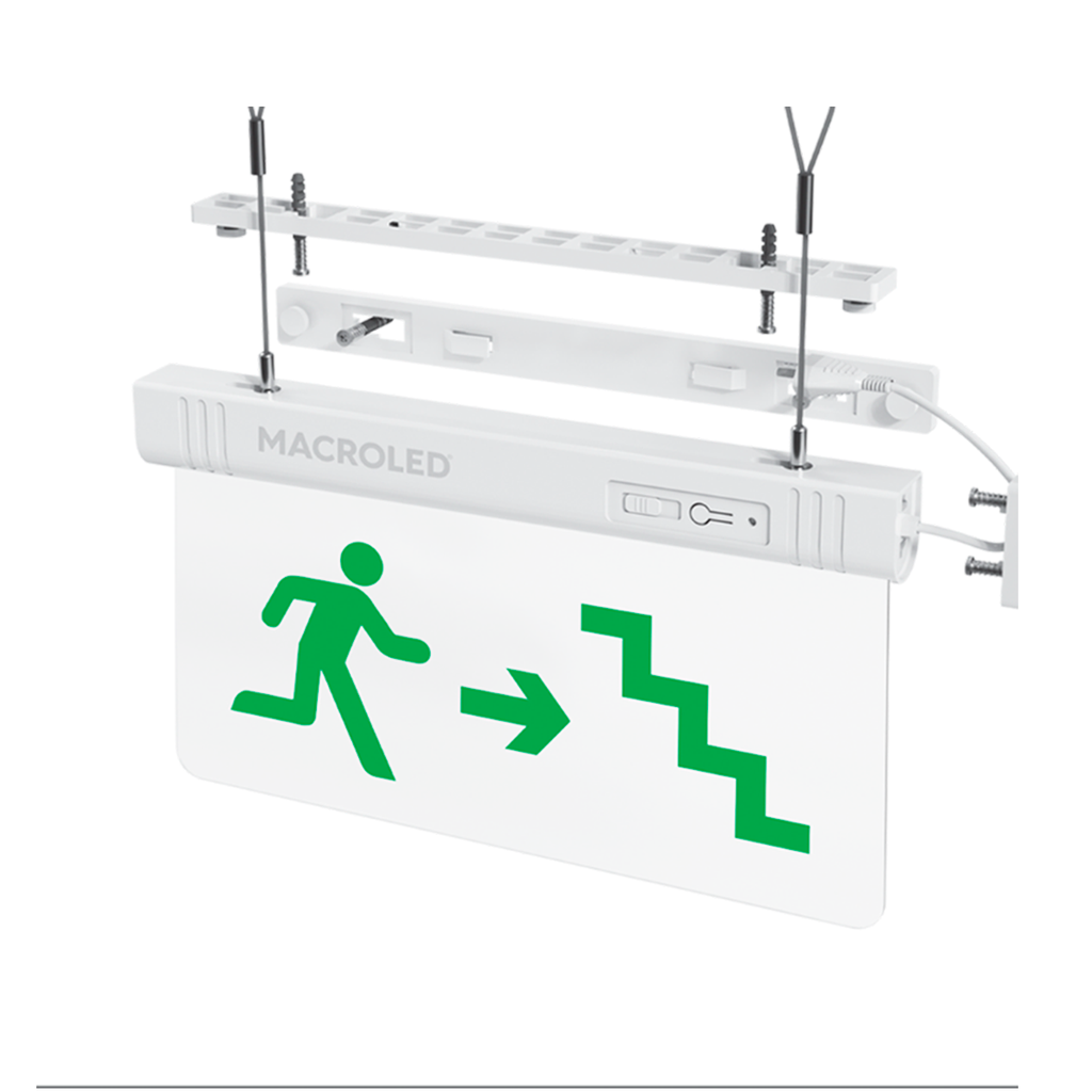 SEÑAL DE EMERGENCIA LED (CSL-ESCALERA) MACROLED, Señal luminosa salida escalera, lista para instalar. Con accesorios de fijación y suspensión incluidos. Autonomía de 3hs. Batería de Litio de 3.7V 800mAh.