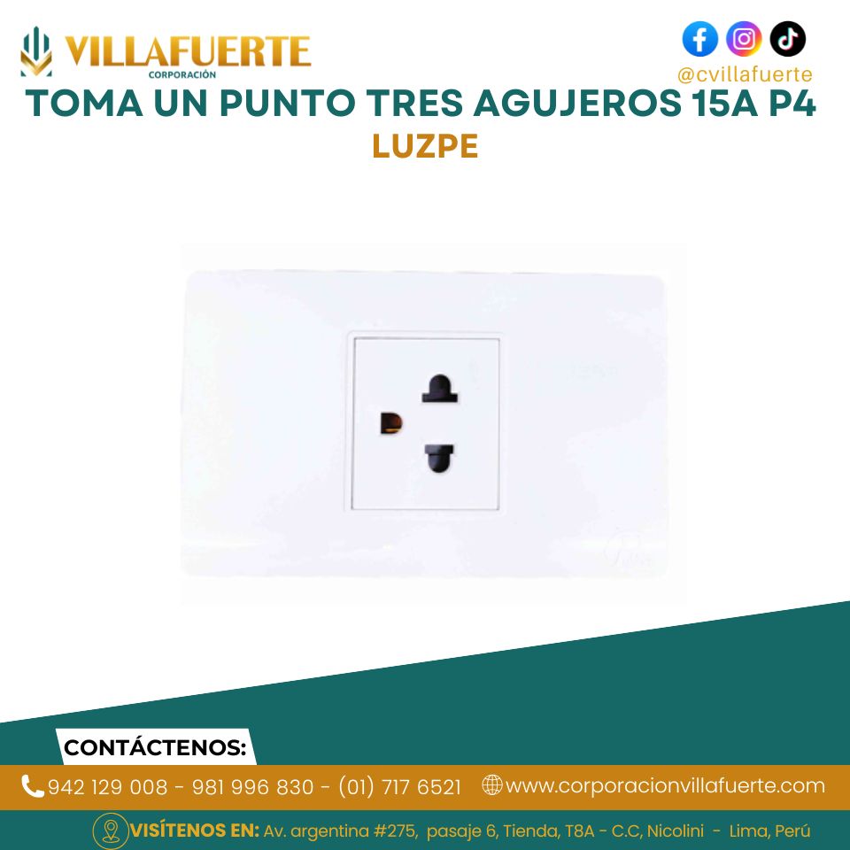 Amperaje: La capacidad es de 15A (amperios). Este tipo de tomacorriente es el más común en hogares y es adecuado para dispositivos de bajo consumo como lámparas, televisores y pequeños electrodomésticos de cocina.