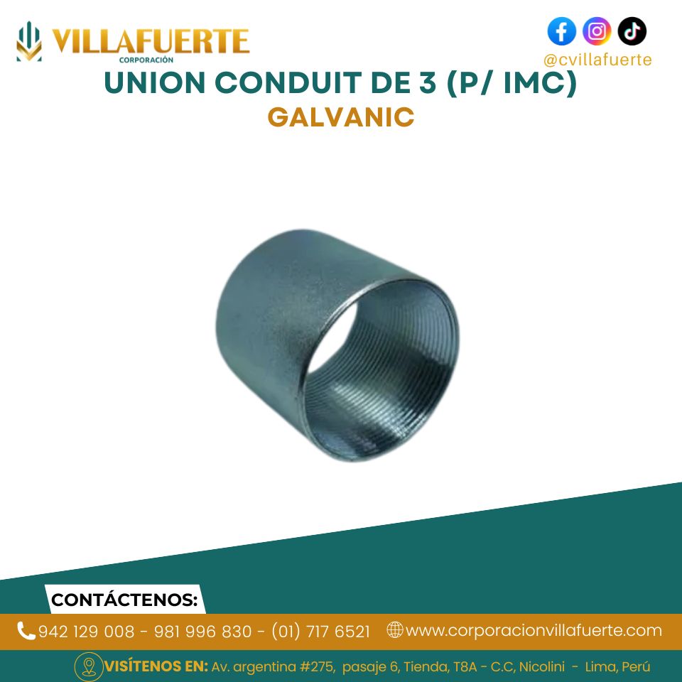 La Unión Conduit 3″ para tubería IMC está diseñada para conectar tramos de conduit de gran diámetro, garantizando continuidad mecánica y protección del cableado eléctrico. Fabricada con materiales de alta resistencia, proporciona un ajuste firme y duradero incluso en instalaciones exigentes. Su diseño preciso facilita montajes seguros y profesionales, siendo ideal para proyectos eléctricos industriales y comerciales donde se requiere una conexión robusta y confiable.