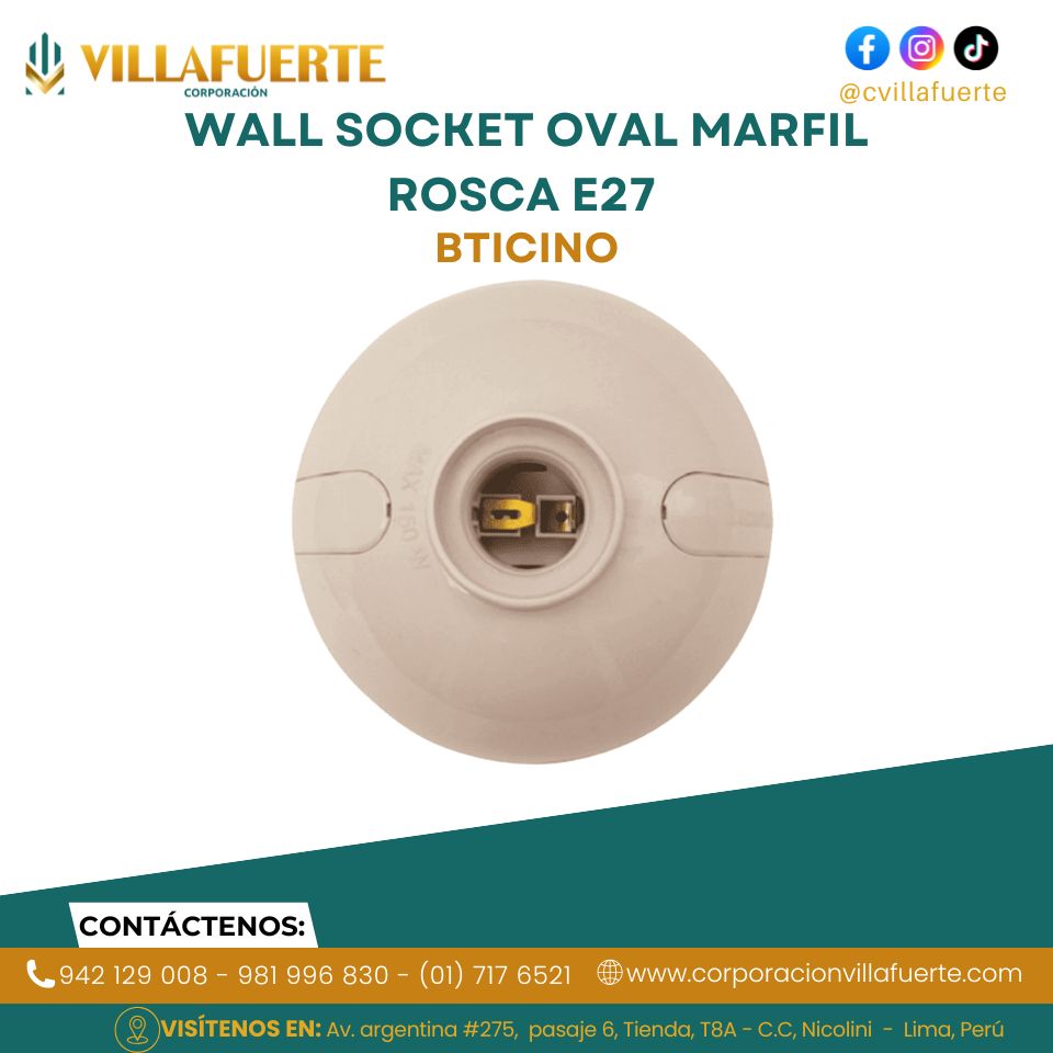 El Wall Socket Oval Marfil con Rosca E27 BTICINO está diseñado para brindar una instalación segura y práctica de lámparas con base estándar E27. Su formato ovalado y acabado en color marfil ofrecen una apariencia estética y discreta, ideal para distintos ambientes. Fabricado con materiales de alta calidad, garantiza resistencia, buen aislamiento eléctrico y durabilidad, siendo una solución confiable para instalaciones residenciales y comerciales.